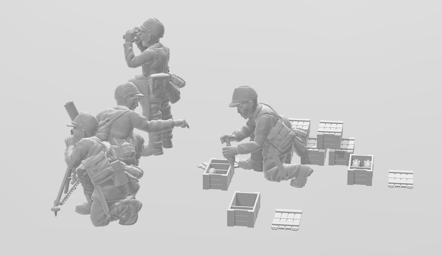 4 models, mortar, 4 cases, 4 mortars. Spotter, Loader, Gunner, Ammo Bearer, M98 Uniform & Type 92 Helmet. 28mm Scale. This product is a Digital product. No physical product is included.